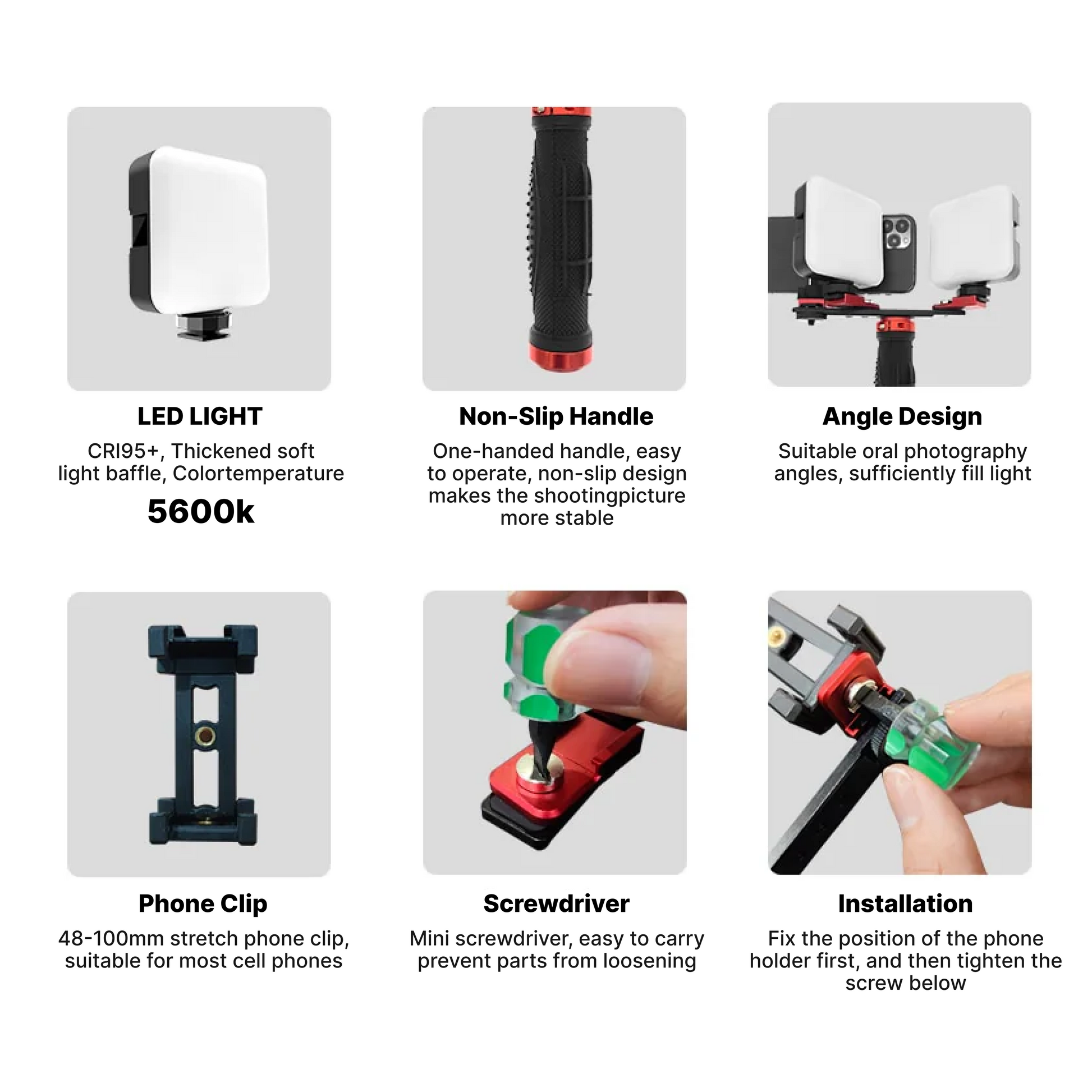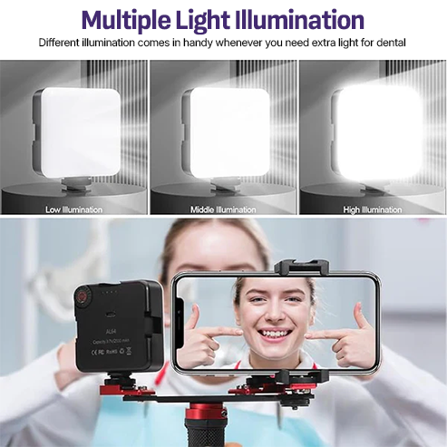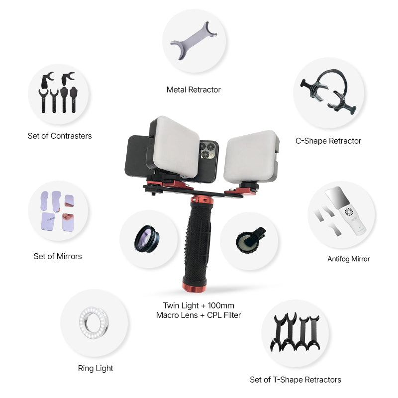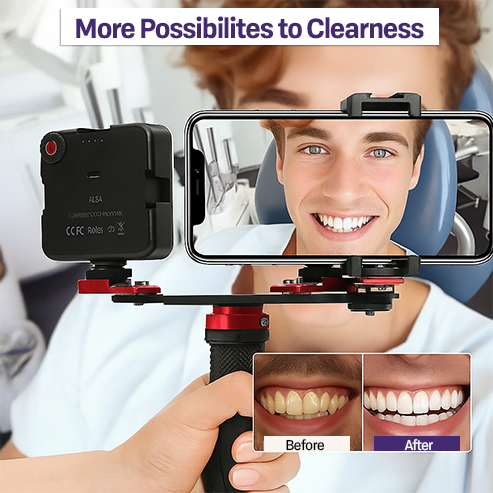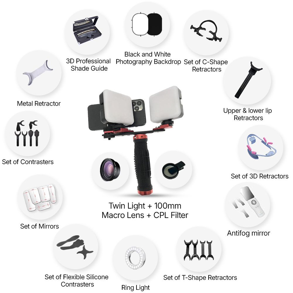Achieve professional-quality clinical photos effortlessly with the Twin Light kit, designed specifically for dental professionals who use mobile phones for photography. The system features dual high-powered LEDs with diffusers, providing soft, even lighting that eliminates shadows and captures every fine detail of teeth and oral structures. Its adjustable brightness ensures optimal lighting for any condition, while the 5600K color temperature mimics natural daylight for clear, accurate, and true-to-life dental images.