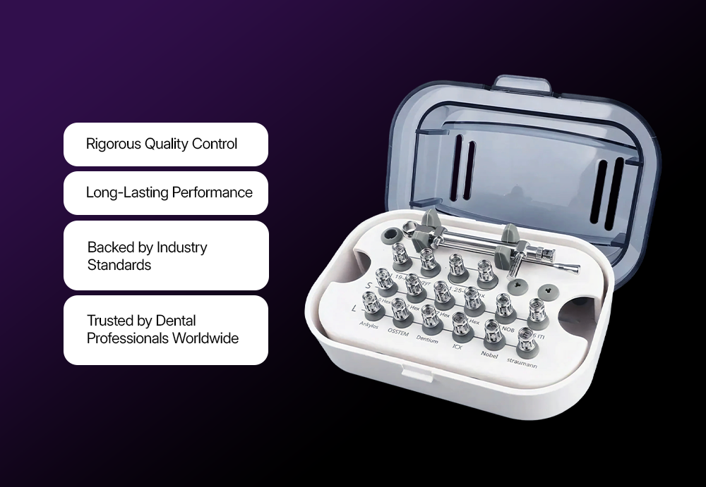 The TorqueBox Implantology Driver Set is engineered for exceptional quality and longevity, ensuring precise and secure implant procedures every time. Crafted from medical-grade stainless steel, this set is built to withstand repeated use while maintaining optimal performance and sterility.